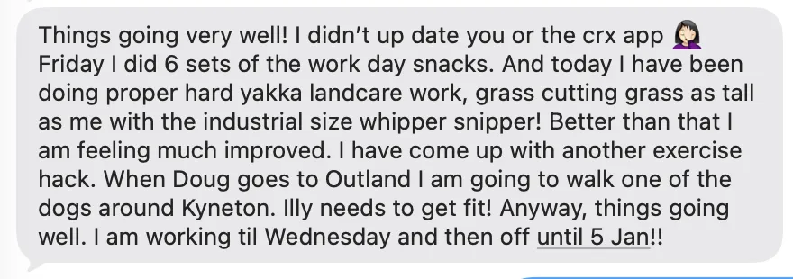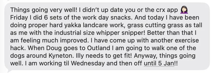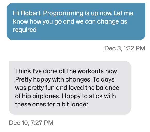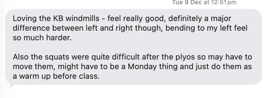 However the most valuable aspect is access, via your coaching software, for any questions you may have at any time - with the ability to get same day answers (on business days), often within the hour. It's like having the coach and physio you used to see once a week or once a fortnight, in your back pocket!