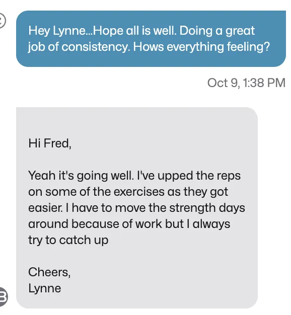Communication is the most important aspect of this relationship. Your coach will programme for you based on objective measures, capacity for training and what's happening for you currently. The more they know, the better. You can't offend us so if you're not enjoying any aspect of the plan, let us know so we can move fast!